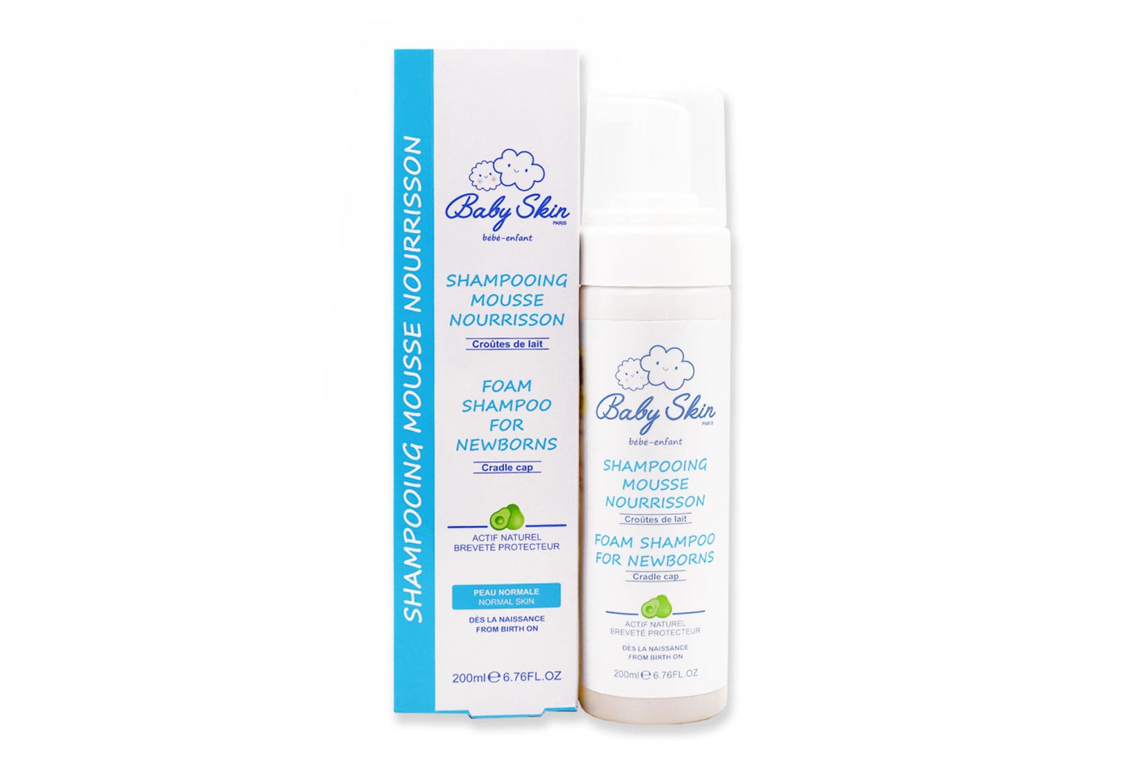 شامپو فوم ضد شوره نوزادان بیبی اسکین به منظور شستشوی پوست سر نوزادان و پاکسازی آن ها از شوره و چربی قابل مصرف از ابتدای تولد در بطری پمپ دار به حجم 200 میلی لیتر تولید و بسته بندی می شود.